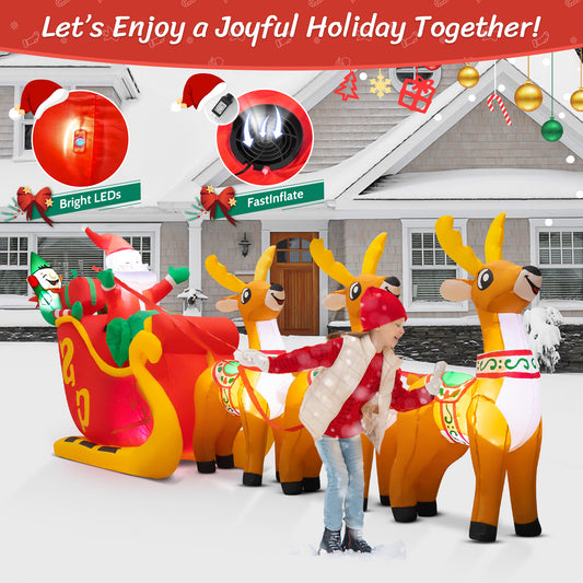 10ft Christmas Inflatable Santa Claus On Sleigh With 3 Reindeer Outdoor Lights Decor for Holiday Decoration, Xmas Party, Yard, Garden and Lawn