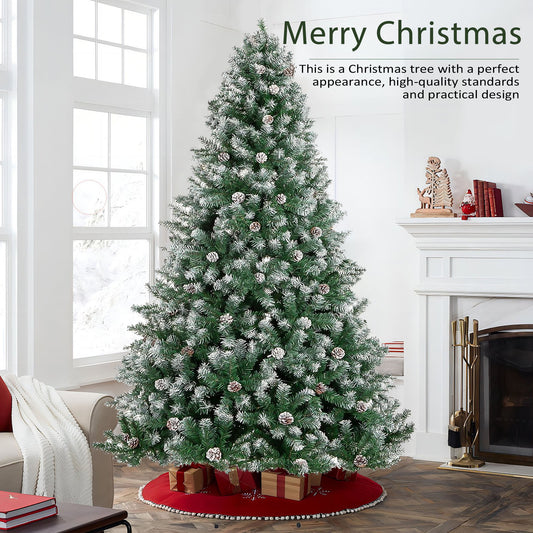 6ft Snow Flocked Christmas Tree, Pre-Lit Artificial White Christmas Tree with 1000 Branch Tips、300 Warm White Lights、48 Inch Faux Fur Christmas Tree Skirt White