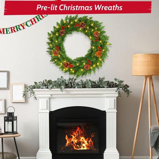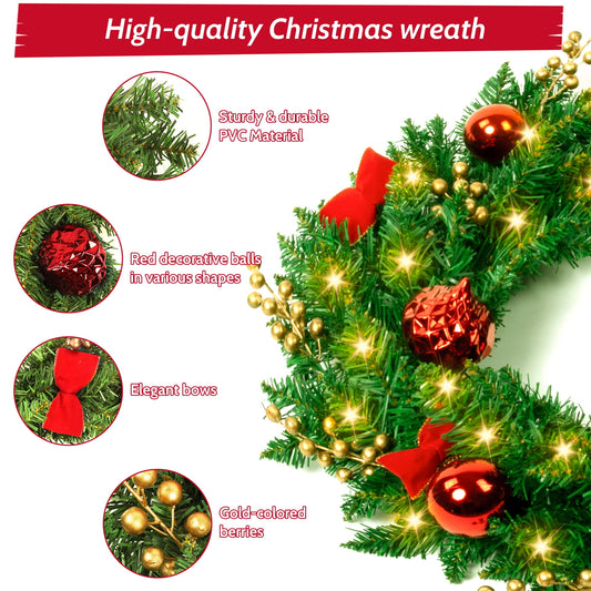 Christmas Wreath, 24" Christmas Wreath for Front Door,Outdoor Christmas Wreath,Battery Powered Christmas Decorations with Lights & Ornament