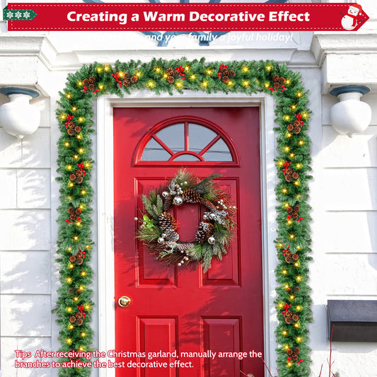 9ft Large Christmas Garland, Multi-Purpose Xmas Wreath with 60 LED Lights, Decorated with Pinecones, Berry Clusters, Battery Operated