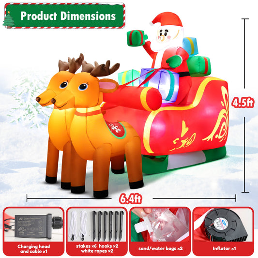 6.3FT Long Christmas Inflatable Santa Claus on Sleigh with Reindeer and Gift Boxes LED Lighted Blow up Outdoor Yard Decoration for Holiday/Christmas/Party/Yard/Garden