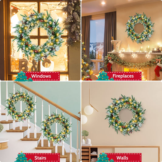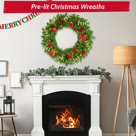 Christmas Wreath, 24" Christmas Wreath for Front Door,Outdoor Christmas Wreath,Battery Powered Christmas Decorations with Lights & Ornament
